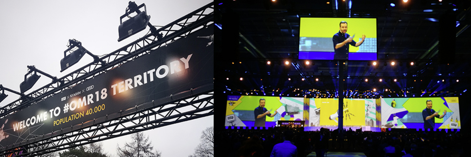 Bereits als wir morgens am Messegelände ankamen, überraschte uns das für eine Konferenz oder Messe, ungewöhnliche Wording bei der Begrüßung: WELCOME TO #OMR18 TERRITORY Population 40.000. Wir fühlten uns gleich irgendwie Teil eines größeren…ja was eigentlich? Vielleicht eines größeren, ziemlich elitären Ganzen im zweitägigen Ausnahmezustands.